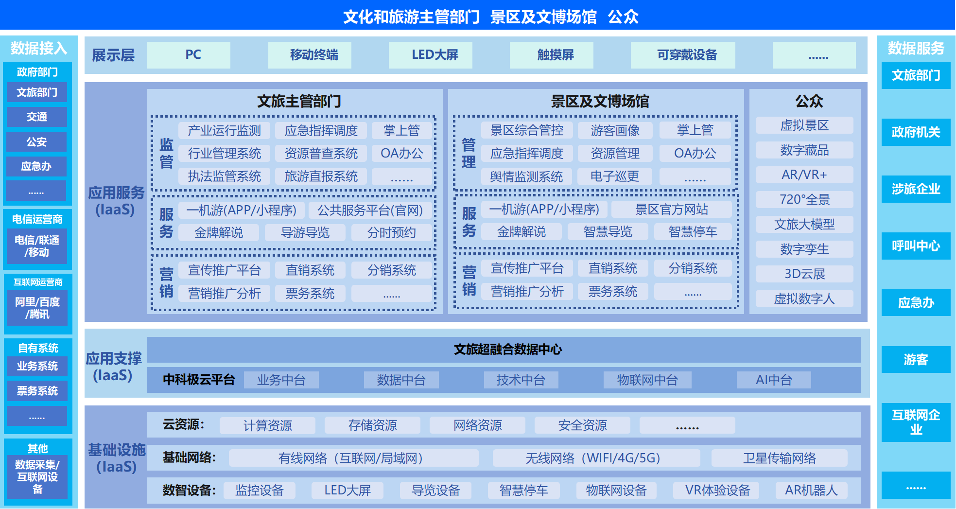 為解決文旅數(shù)據(jù)融合難、業(yè)態(tài)多監(jiān)管難、資訊發(fā)布渠道雜亂、游客體驗(yàn)差等問(wèn)題,中科信息以Al、大數(shù)據(jù)、物聯(lián)網(wǎng)等基礎(chǔ)產(chǎn)品為支撐,以應(yīng)用場(chǎng)景為抓手,聚焦文旅融合創(chuàng)新,為政府、景區(qū)、文博場(chǎng)所等提供全流程服務(wù)和管理的解決方案,覆蓋基礎(chǔ)設(shè)施建設(shè)、文旅大數(shù)據(jù)、智慧服務(wù)、智慧管理、智慧運(yùn)營(yíng)等應(yīng)用場(chǎng)景,實(shí)現(xiàn)管理智能化、服務(wù)一機(jī)化、營(yíng)銷深入化,從而促進(jìn)文旅融合發(fā)展,全面支撐文旅監(jiān)管決策,提高旅游公共服務(wù)質(zhì)量。